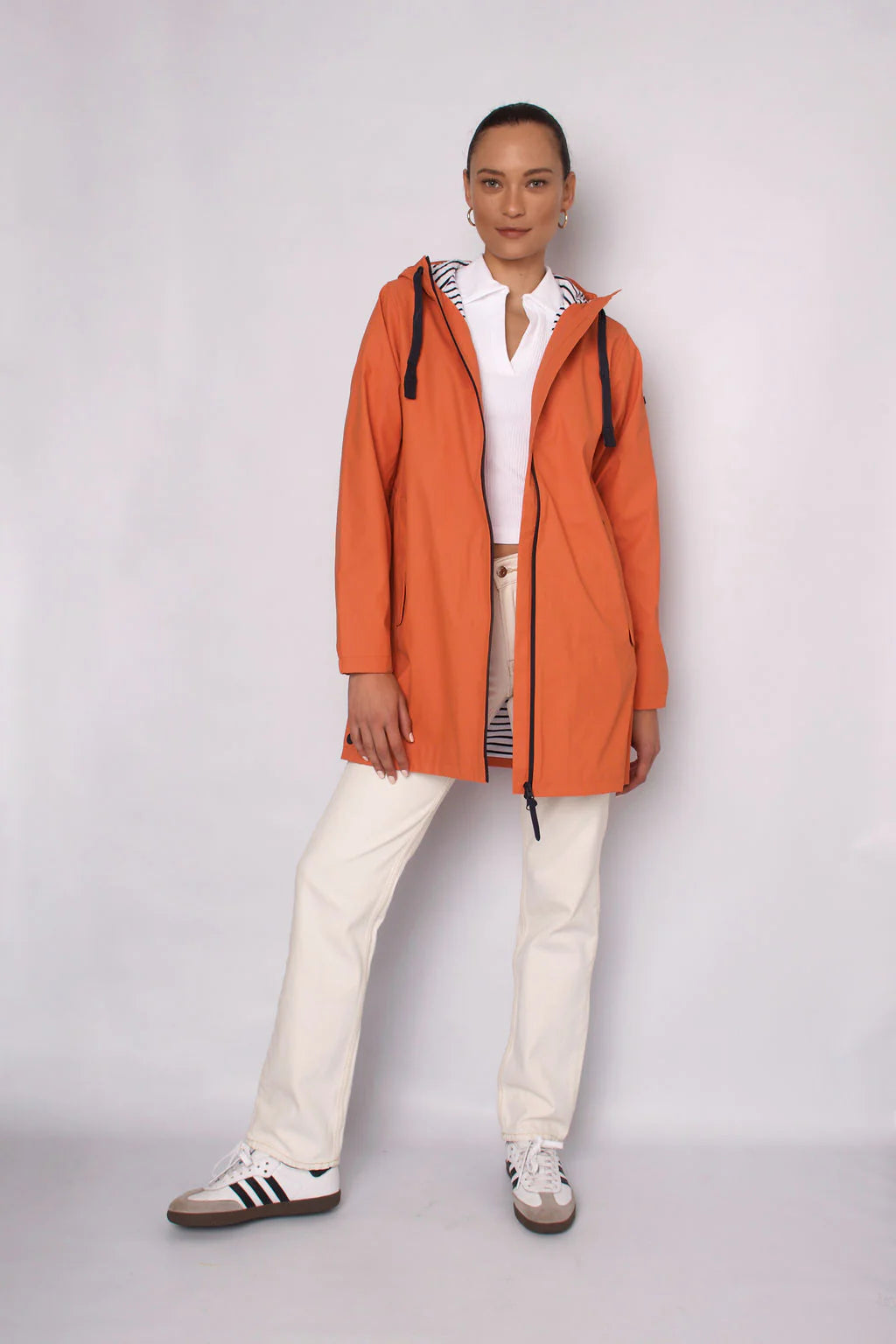 Detachable hood. Adjustable cuffs. Drawstring in waist. Iconic striped cotton lining. 100% polyurethane outer making this jacket soft, light & breathable. Waterproof. Expert attention to detailing & finishes. Made in Spain.