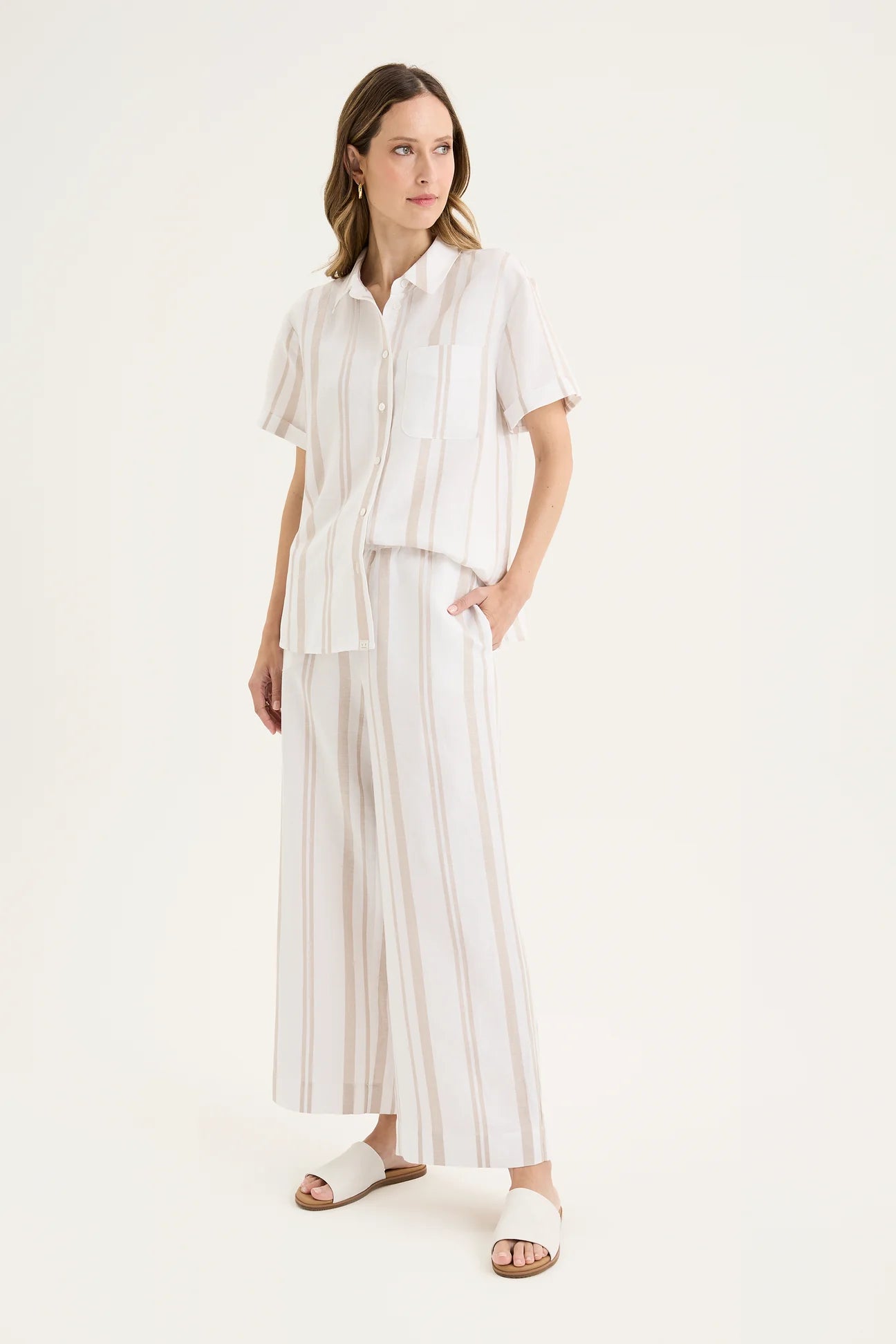 The Byron Shirt is a warm-weather essential reimagined in a timeless stripe. Crafted from a breathable linen blend, it’s a short sleeve shirt designed with a traditional shirt collar, a button-through front, and a chest pocket for classic structure. Yarn-dyed vertical stripes in a cream colour create a clean, elongating effect, while the short sleeves are finished with turned-up cuffs for a relaxed touch. A back yoke and dual curved hem ensure the fit feels easy yet flattering across many body types. Styled loose or tucked, it’s a versatile piece on its own - and when paired with the matching Byron pants.