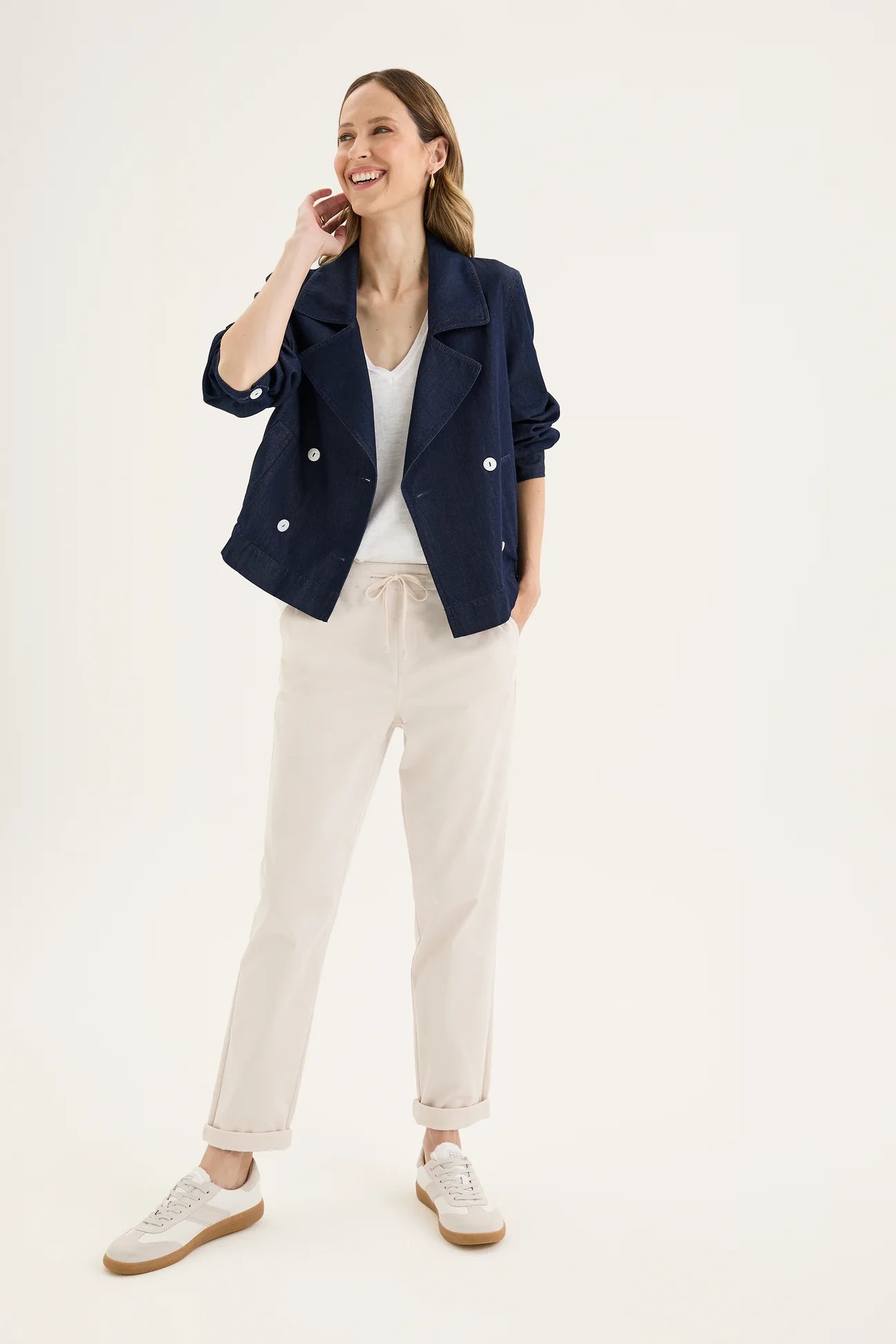 Crafted from lightweight stretch denim in a dark indigo wash, the Vernal Denim Jacket combines classic comfort with tailored structure. It features a wide collar and a double-breasted front, creating a flattering statement silhouette that instantly elevates your everyday outfits. The boxy, cropped fit is softened by a semi-elasticated hem, designed to sit neatly at the waist - perfect for layering over dresses, tees, or knits. Long sleeves with buttoned cuffs and large functional welt pockets add thoughtful detail and quiet utility. This is the kind of jacket that slips effortlessly into your wardrobe - versatile, modern, and finished with a quietly polished look.